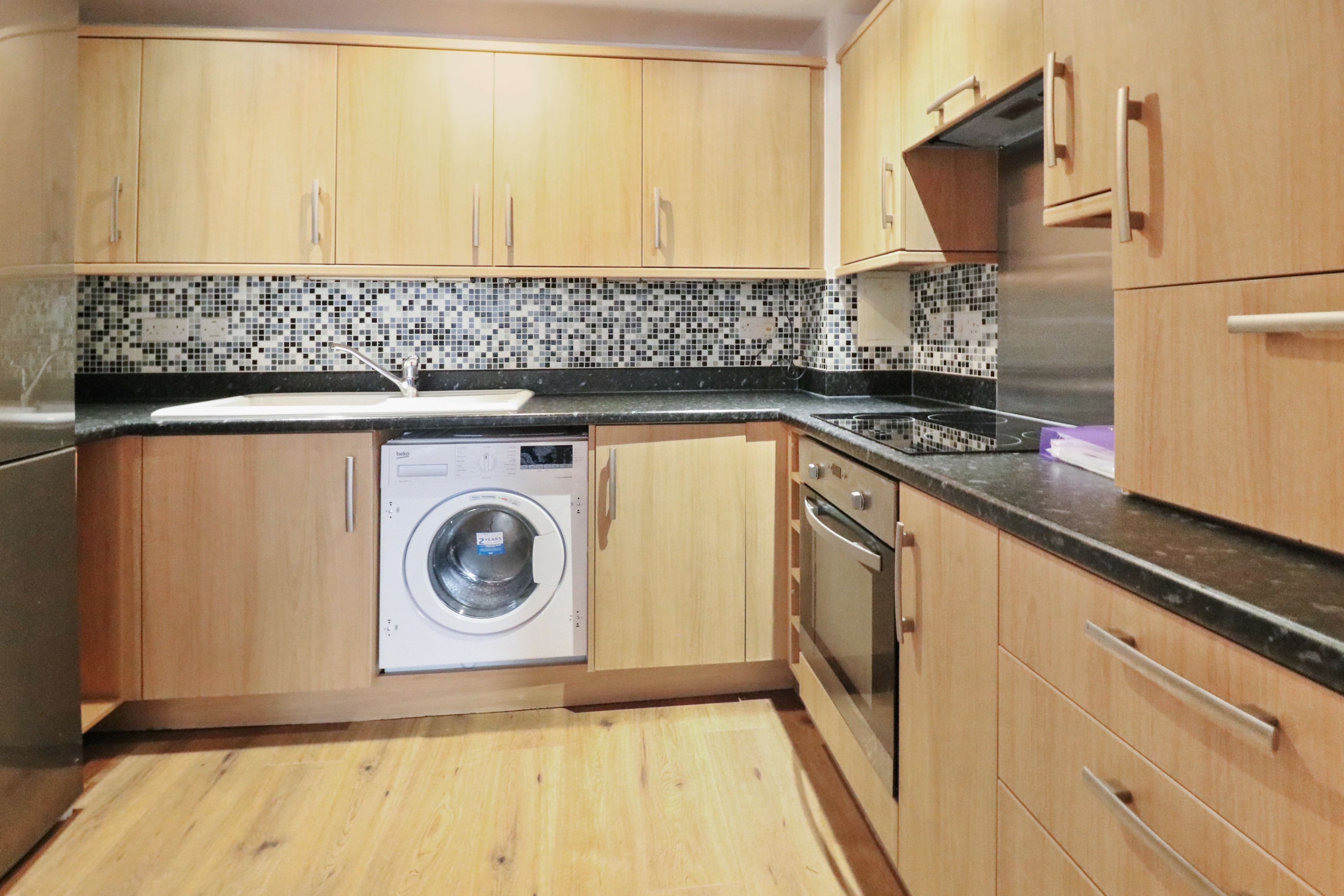 The dual-aspect living space is bright and welcoming, with a fitted kitchen that includes an integrated oven, hob, and washing machine, plus space for a freestanding fridge-freezer. The layout is ideal for entertaining or relaxing, with ample room for both dining and lounging.