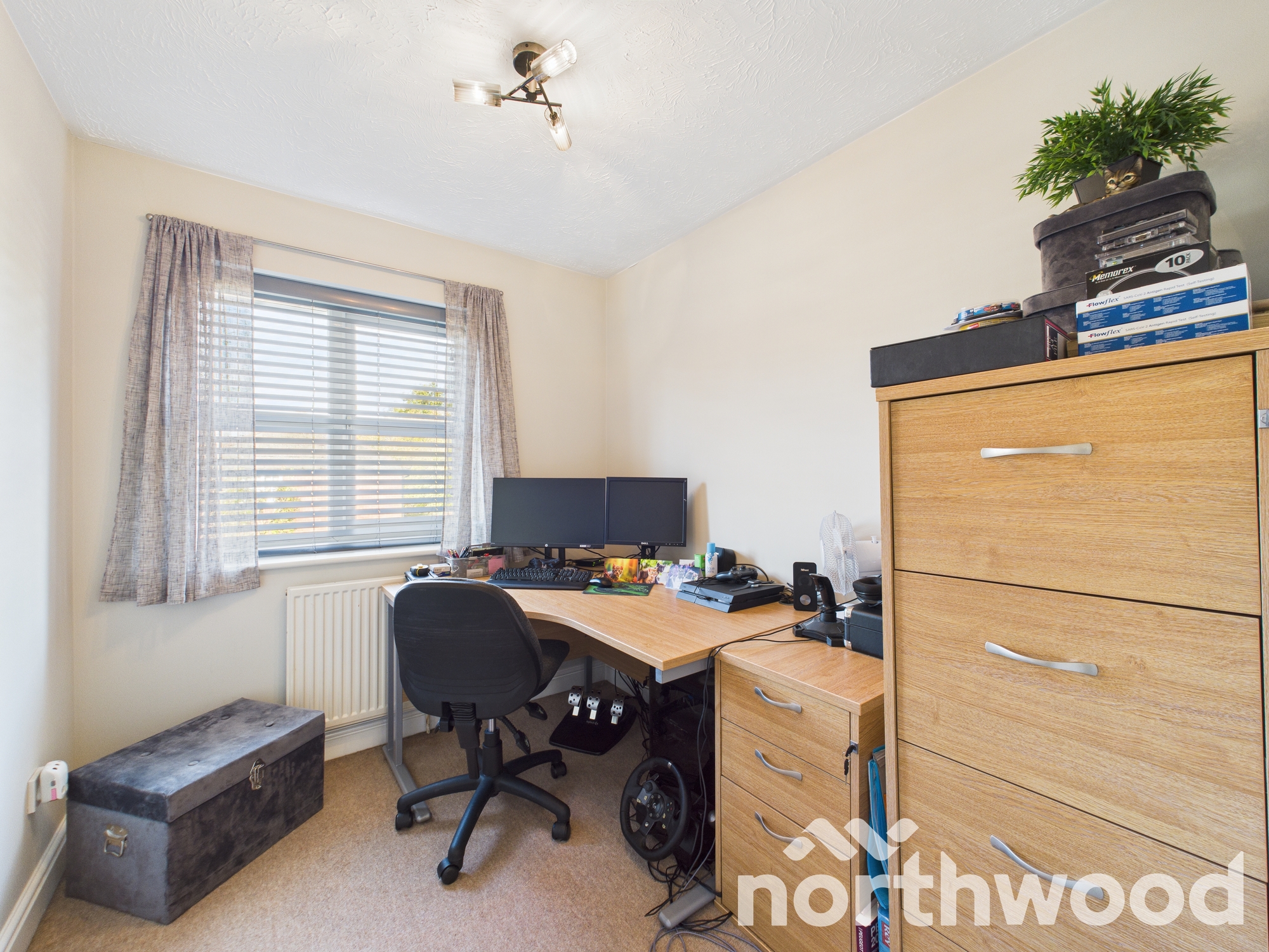 Upstairs, the property offers two generous double bedrooms and a third single bedroom currently used as a home office. Each room is well-presented, with neutral décor and ample natural light. The family bathroom is smartly finished with warm beige tiling and a clean white suite comprising a curved-edge bathtub, wall-mounted sink, and low-level WC. A unique feature window adds a touch of character while allowing natural light to brighten the space. Thoughtfully arranged shelving and fittings make this a practical and stylish room