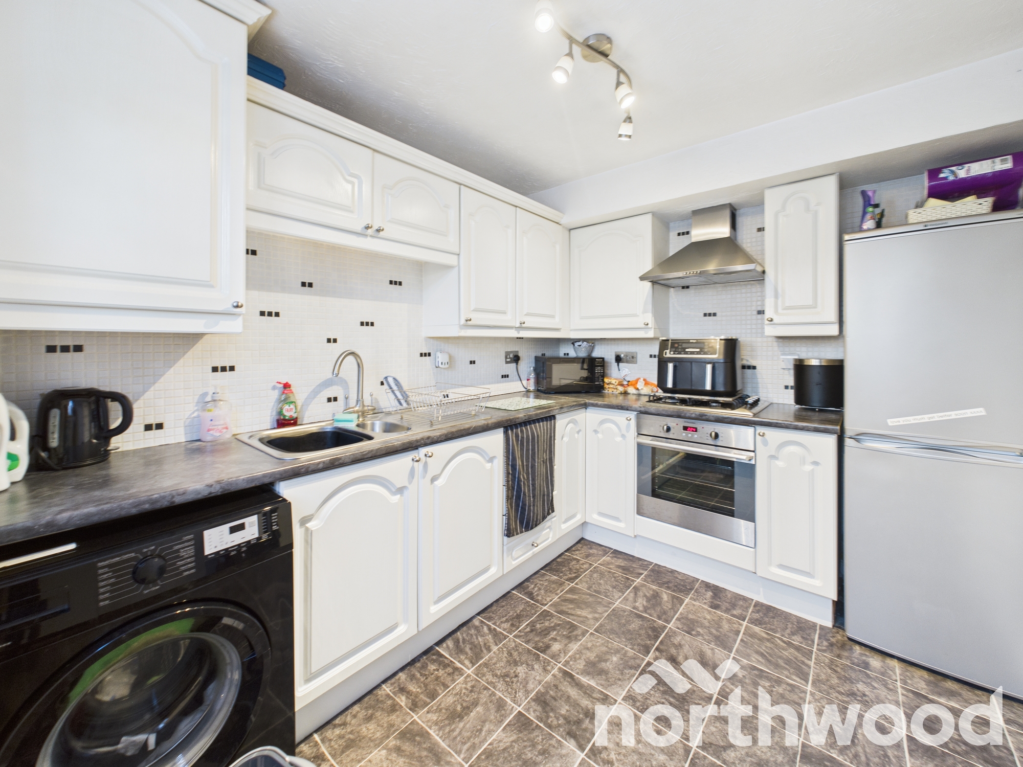 Step into a welcoming entrance lobby with access to a convenient downstairs cloakroom featuring WC and basin. The front-facing living room is bright and inviting, with a large window overlooking the front garden and a staircase leading to the first floor. An archway opens into a dedicated dining area, ideal for family meals and entertaining. The kitchen is sleek and functional with crisp white cabinetry, dark worktops, and a stylish tiled splashback with monochrome accents. It’s fully equipped with integrated appliances including a stainless steel oven, hob, and extractor, plus space for a washing machine and fridge-freezer. The layout flows effortlessly into the conservatory, offering additional living space and direct access to the rear garden