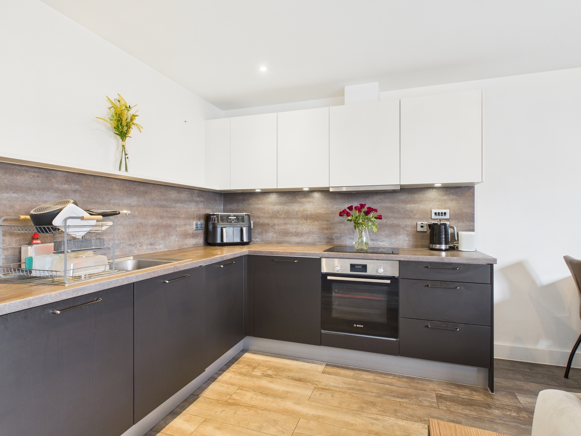 A superb entertaining space (17’2″ x 16’10” / 5.25 x 5.15 m) with ample room for dining and relaxing. Full-height glazing opens onto a private balcony with views towards central Ashford. The modern kitchen is fully fitted with integrated appliances including fridge/freezer, electric oven and hob, extractor, and dishwasher, complemented by generous cupboard and worktop space.