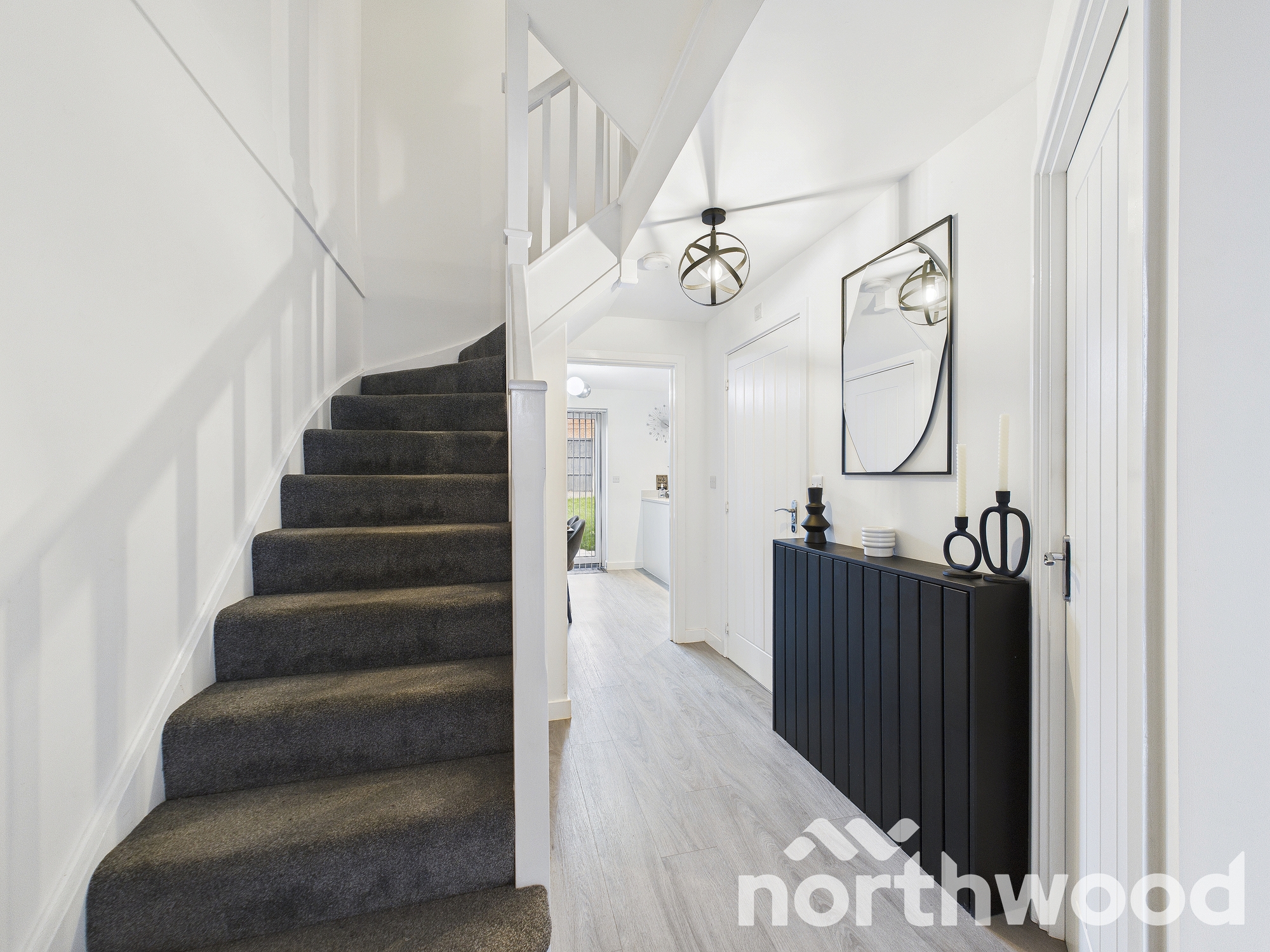 The ground floor welcomes you with a wide entrance hall and flows seamlessly into a bright kitchen/diner, where sleek navy cabinetry is paired with crisp granite work surfaces for a premium finish. Integrated appliances, a central island, and ambient lighting create a space that’s both practical and perfect for entertaining.