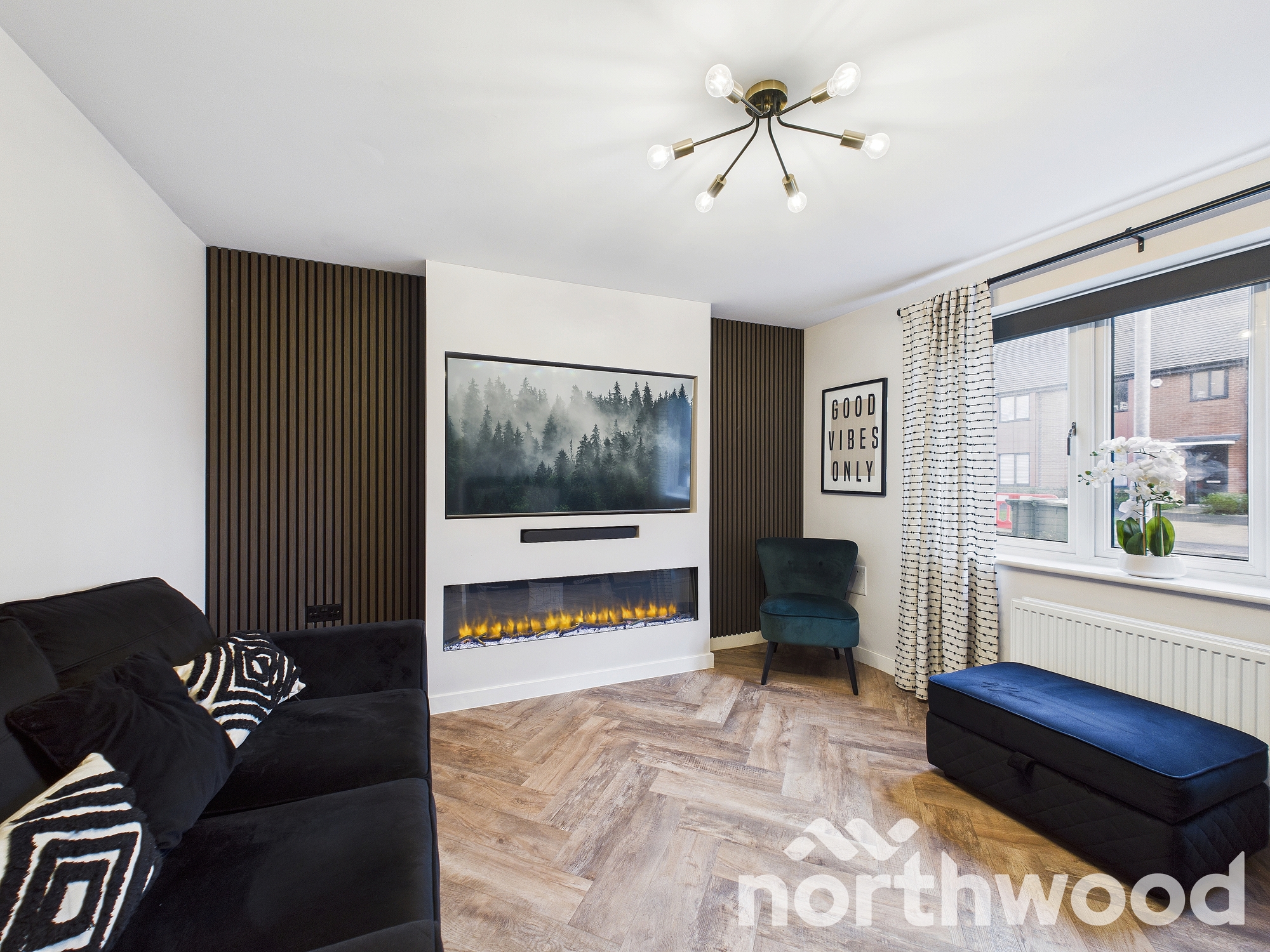 The light wood-effect flooring runs throughout the hallway and kitchen, enhancing the sense of space and continuity. A separate utility room and cloakroom add convenience, while the living room complete with a bespoke media wall and built-in electric fire offers a cosy retreat. The wood–effect herringbone flooring adds warmth, texture, and elegance, elevating the overall ground floor aesthetic.