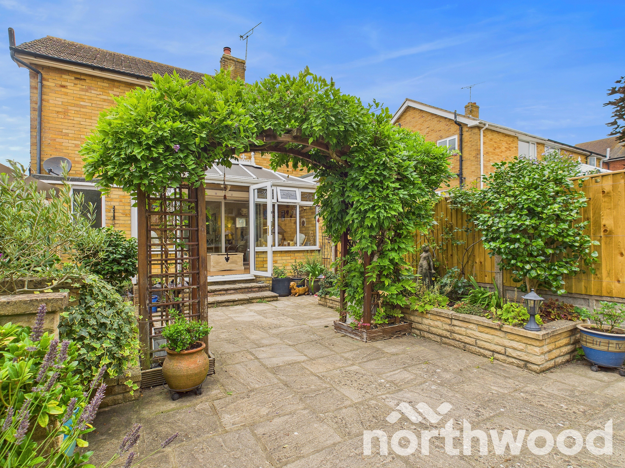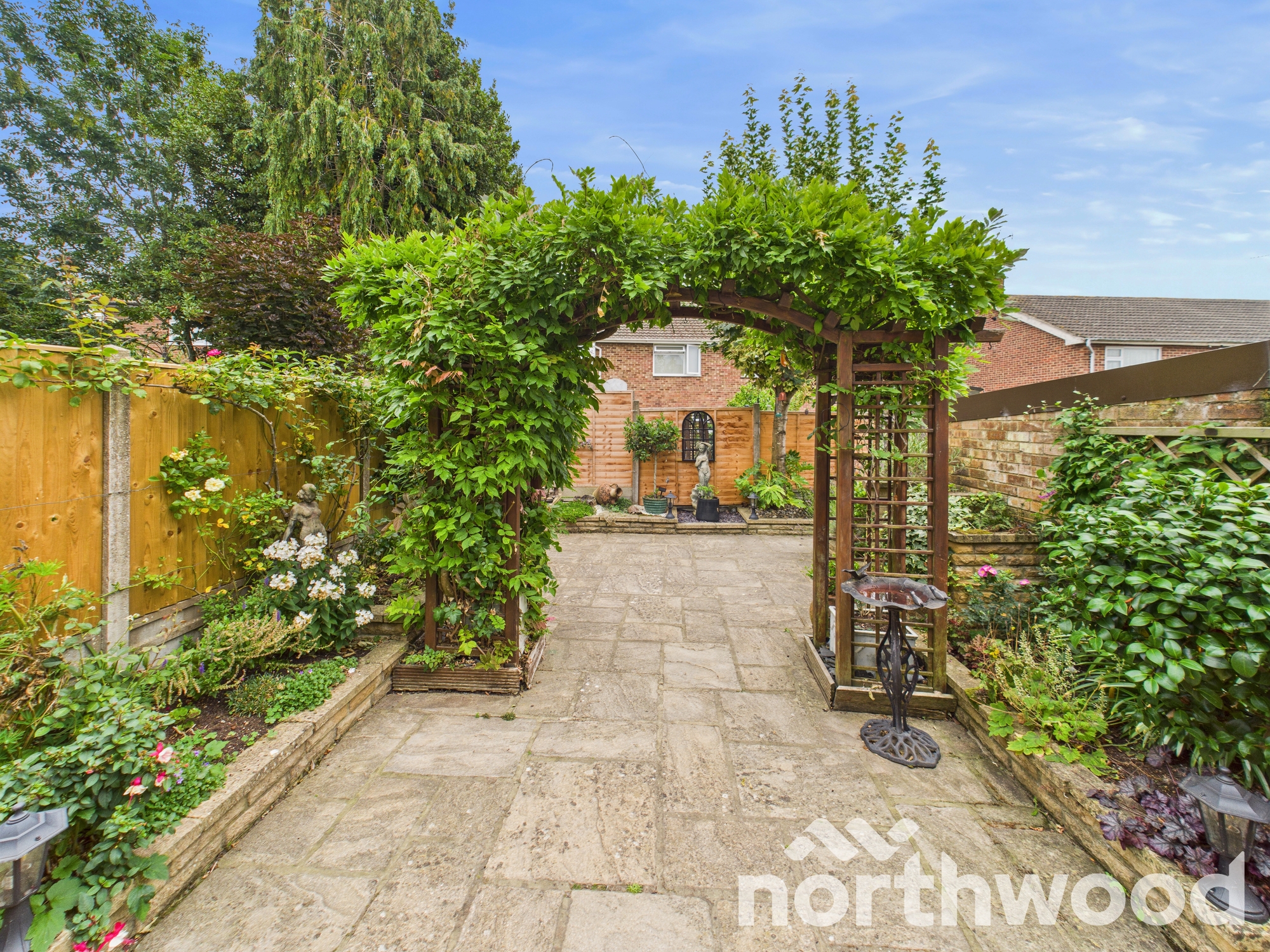 From the conservatory, steps lead down into a beautifully landscaped garden. This outdoor haven features a stone terrace, raised stone planters, and a pergola arch adorned with mature wisteria. A variety of vibrant flowers, plants, and shrubs add colour and texture throughout. A sunken terrace offers a secluded spot for outdoor dining or lounging, all well-screened by close-board fencing for privacy and tranquility.