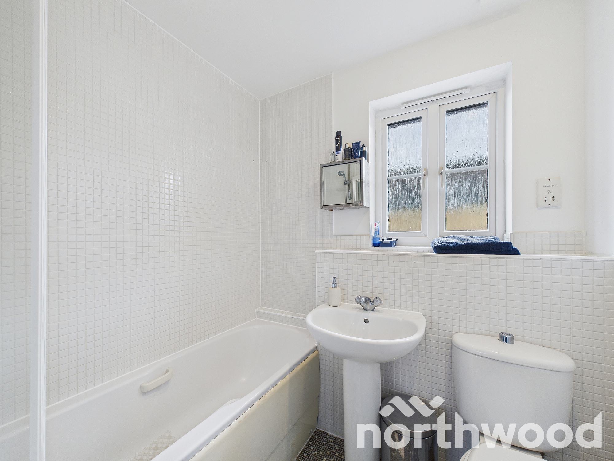 Crisp white suite with pedestal basin, frosted window, and full tiling — stylish, light-filled, and easy to maintain (approx. 6’6″ x 6’8″).