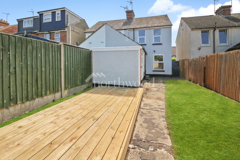 To the front, the property benefits from a single garage with steps rising to the front door and a small garden area. The generous rear garden is mainly laid to lawn and features a newly installed decked terrace, perfect for outdoor dining and relaxation. A rear gate leads directly to a private driveway with a further garage in need of re-modelling plus parking for two vehicles, accessed via Gordon Close.