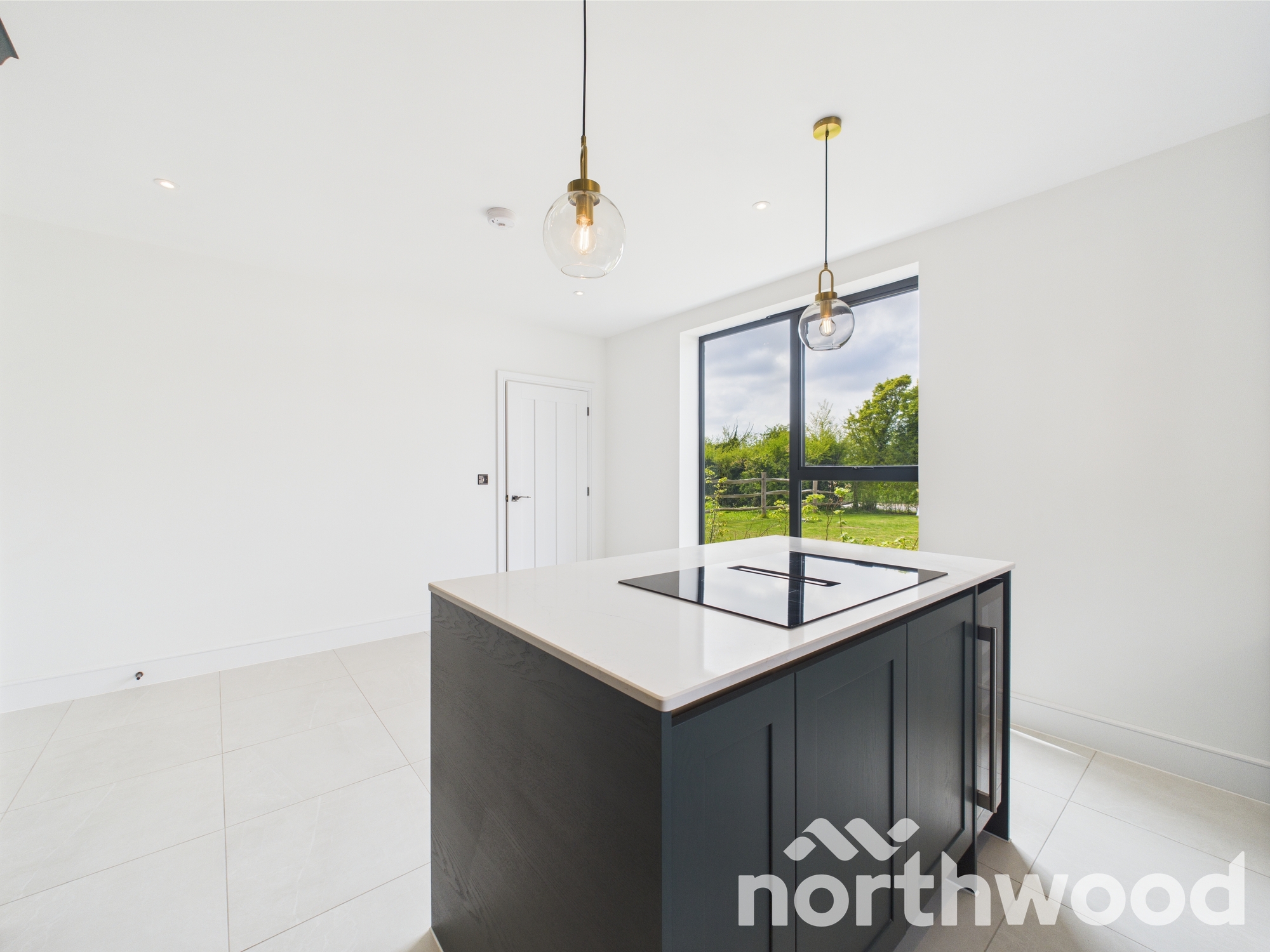 - Large induction hob, downdraft extractor, and wine cooler on the island.
