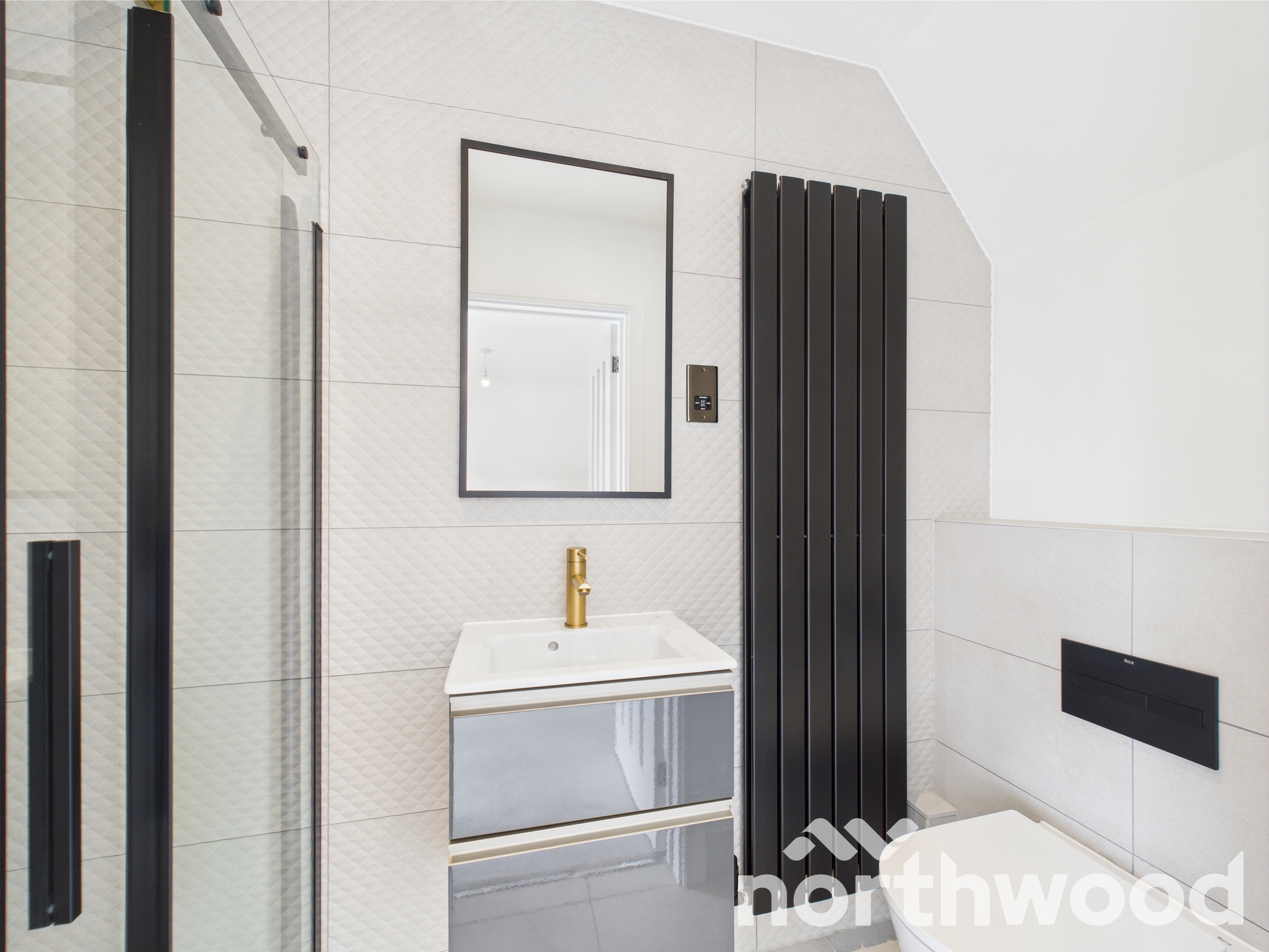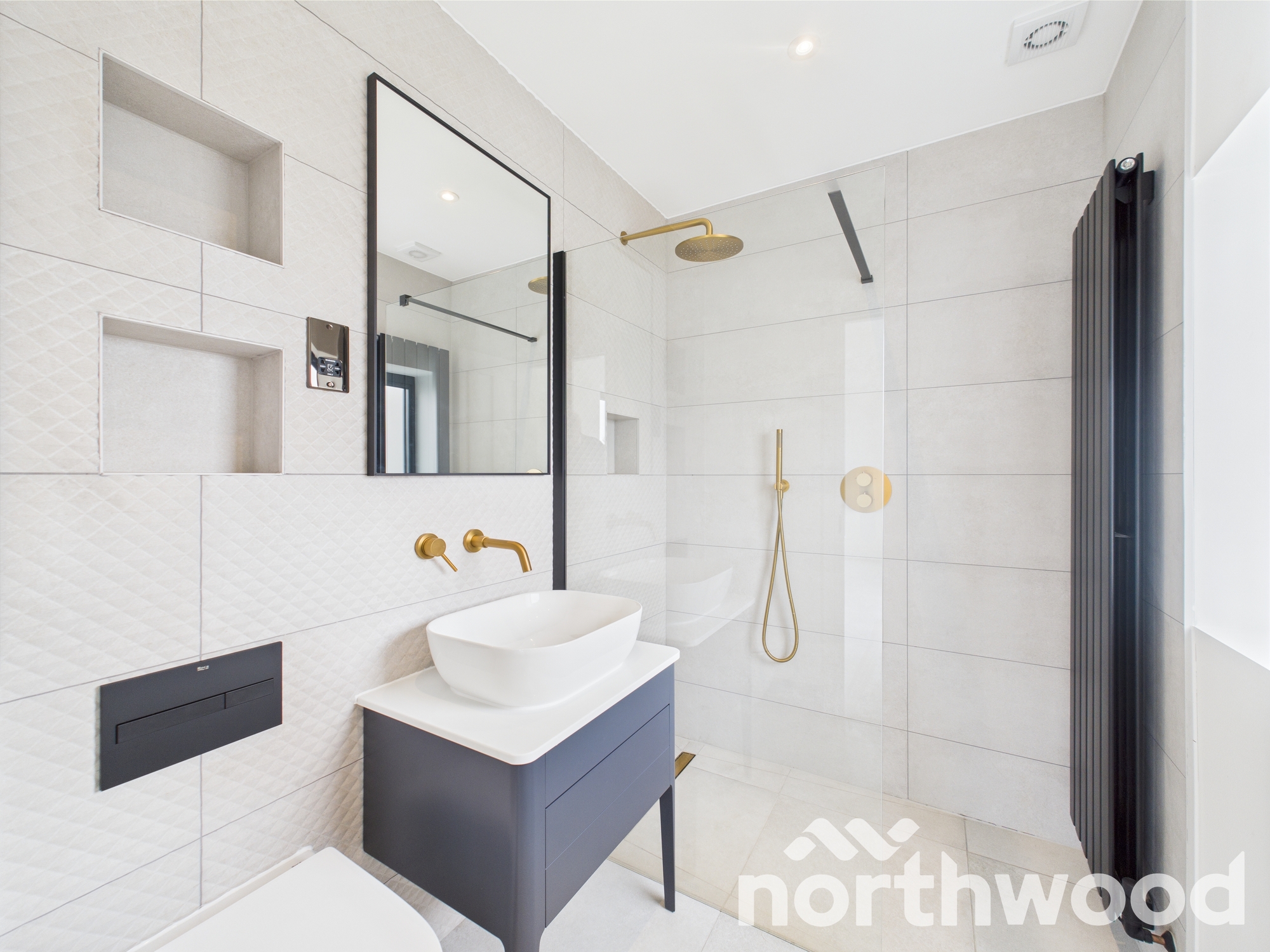 - Black heated towel rails with thermostatic valves in bathrooms and en-suites.