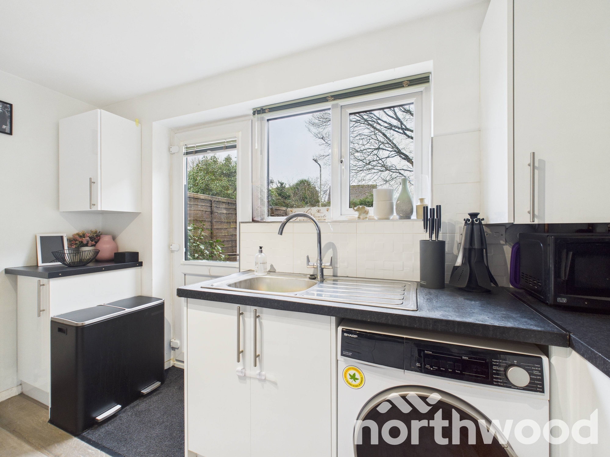 To the rear, the kitchen combines modern design with everyday practicality whether you are cooking, dining or simply enjoying a morning coffee. It features sleek white cabinetry with black worktops, a stainless steel oven with extractor, space for a washing machine and freestanding fridge freezer, and a stainless steel sink with drainer positioned beneath a large window that overlooks the garden. A door to the rear provides direct access outside, making the space ideal for busy households and easy outdoor dining in the warmer months.Â