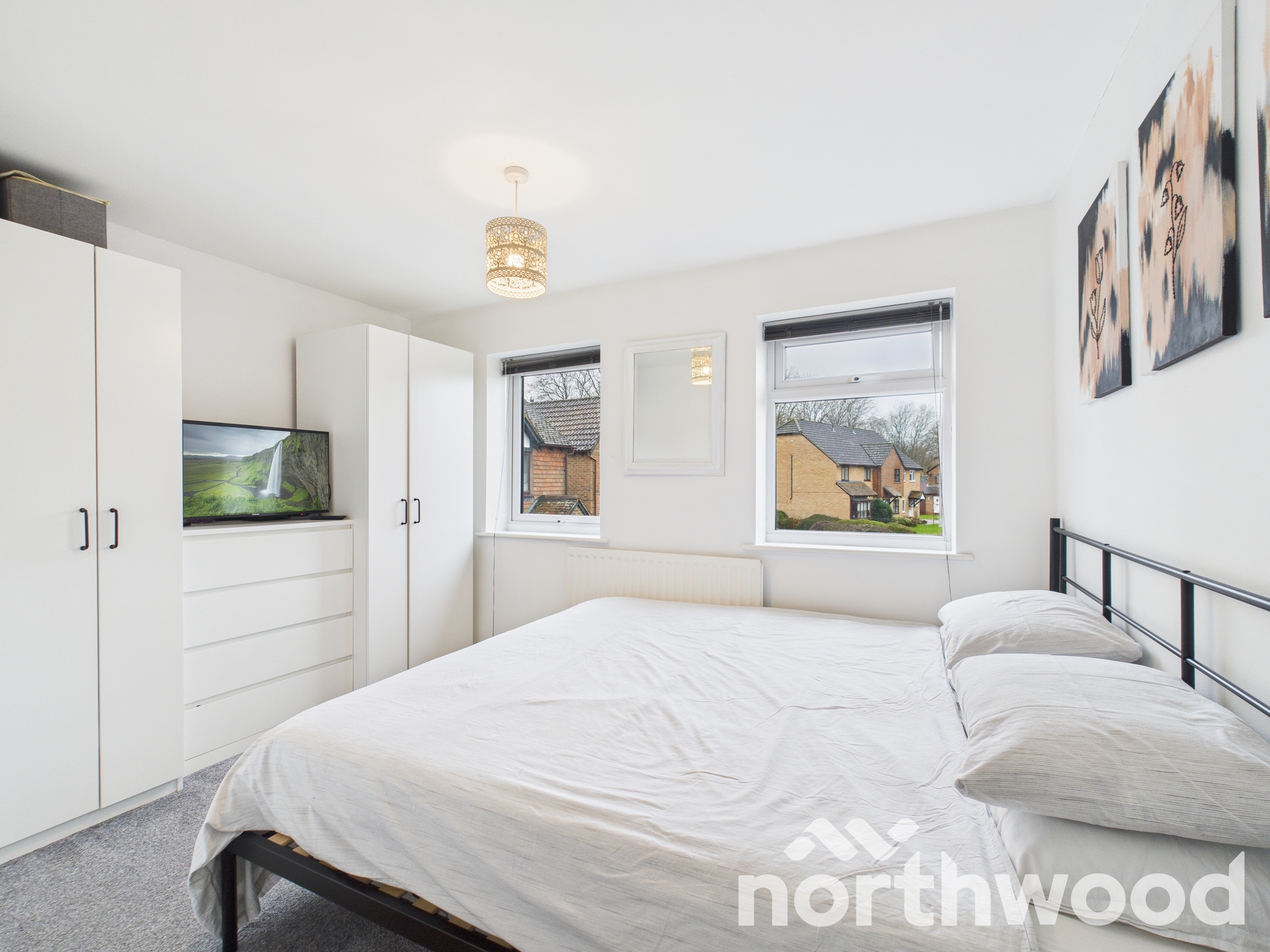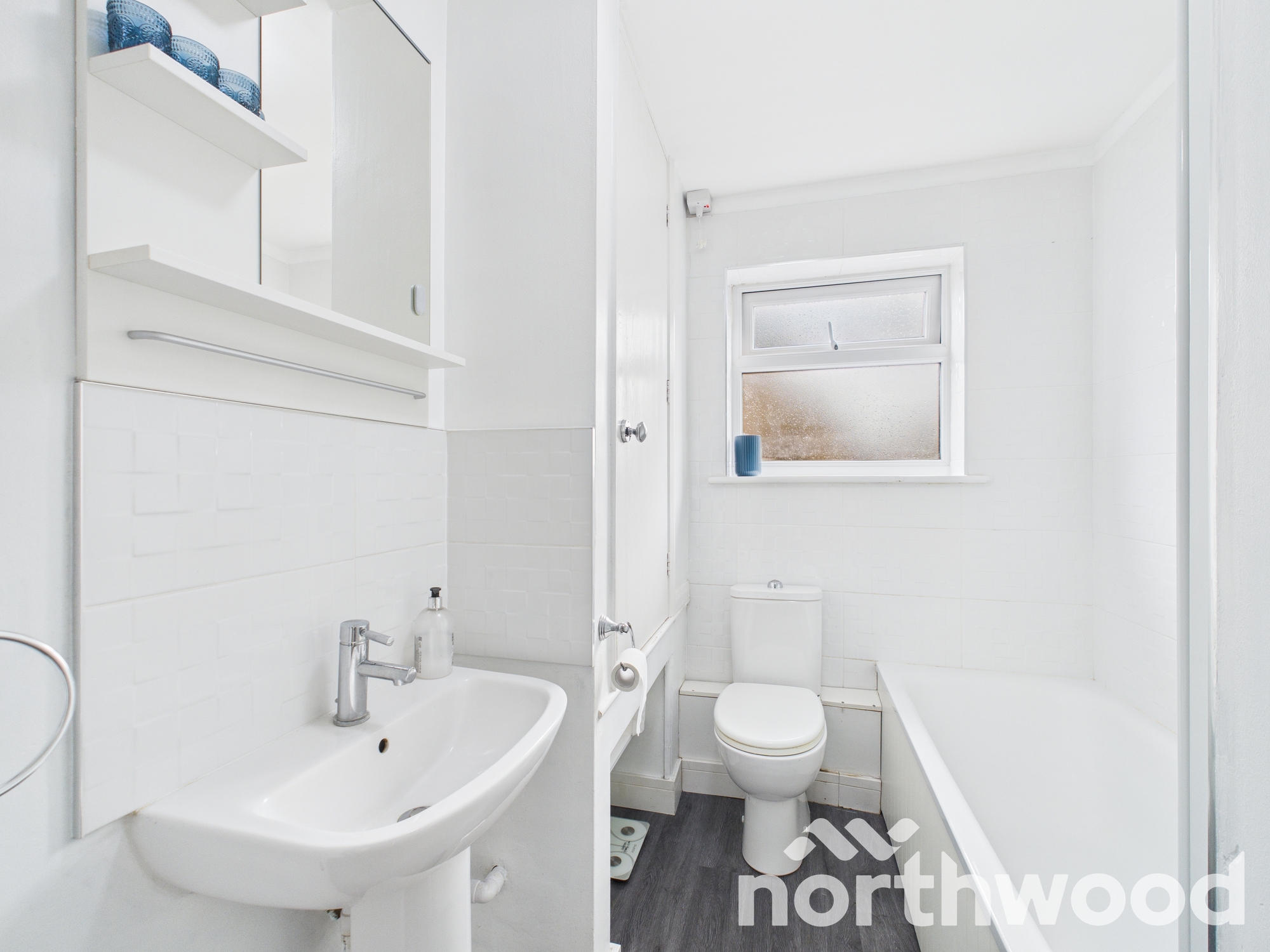 Upstairs, both bedrooms are well proportioned and thoughtfully presented. The principal bedroom benefits from dual windows and space for wardrobes, while the second bedroom offers flexibility for a nursery, guest room or home office. The bathroom is finished in a modern white tile, complete with a basin, WC and full size bath with overhead shower.