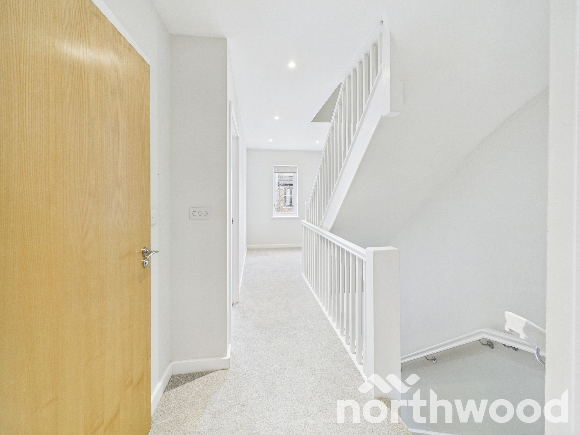 The first floor landing is bright and spacious, continuing the home’s fresh dĂ©cor and soft carpeting. It provides access to the bedrooms and family bathroom.