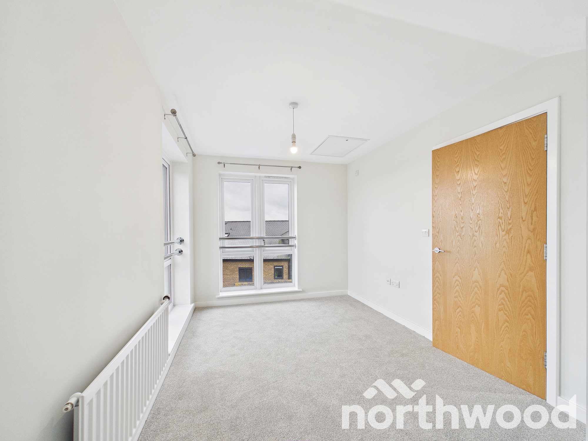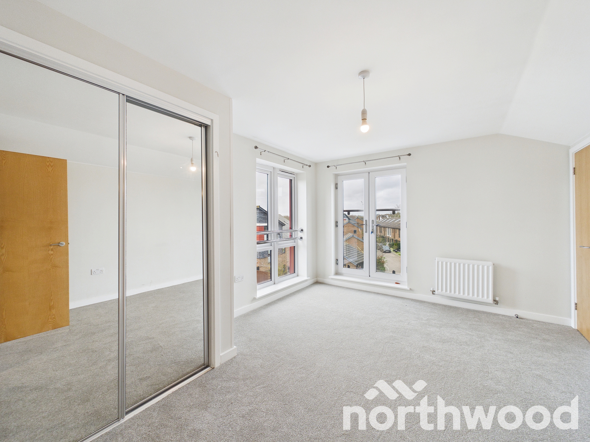 A superb top floor bedroom with Juliet balcony, built in mirrored wardrobes, soft carpeting, and chrome detailing. A bright, elegant space with a calm, elevated feel.
