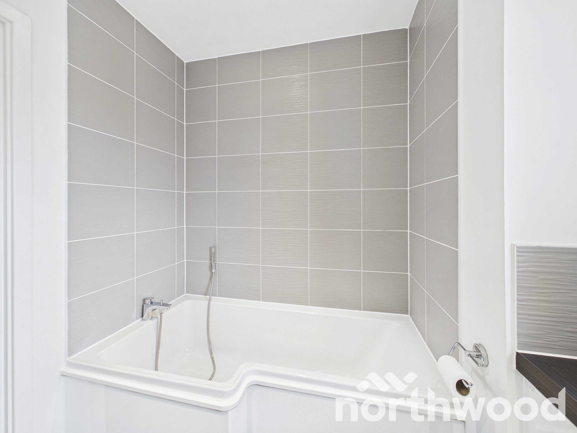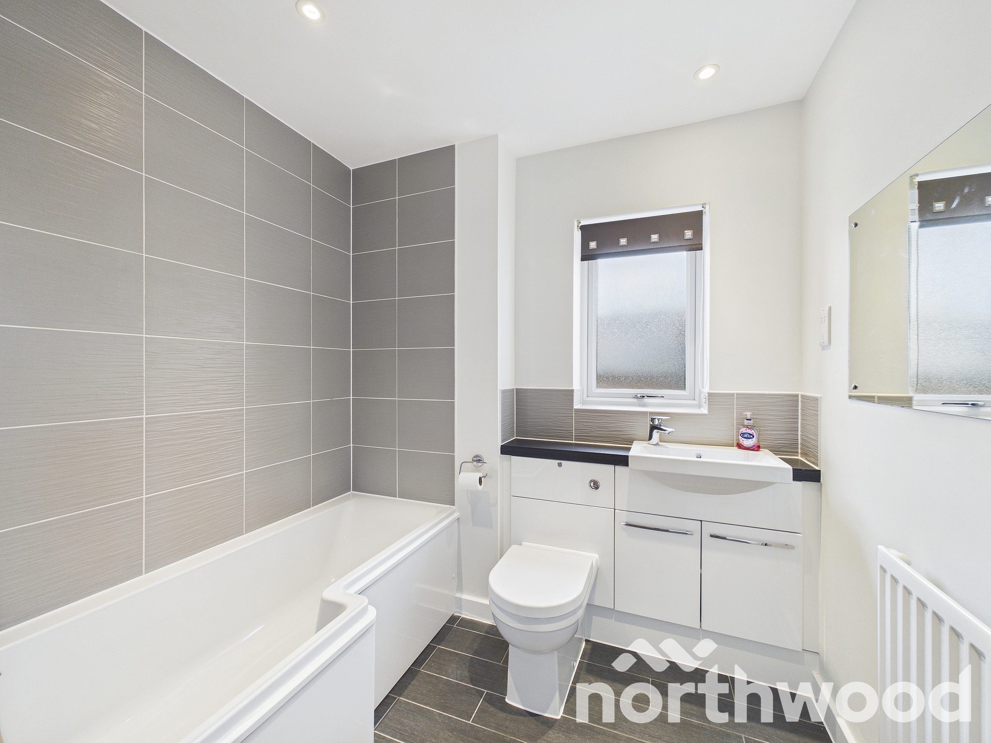 Finished in a clean, contemporary style with a full size bath, modern tiling, vanity storage, and WC. A frosted window ensures natural light and privacy.