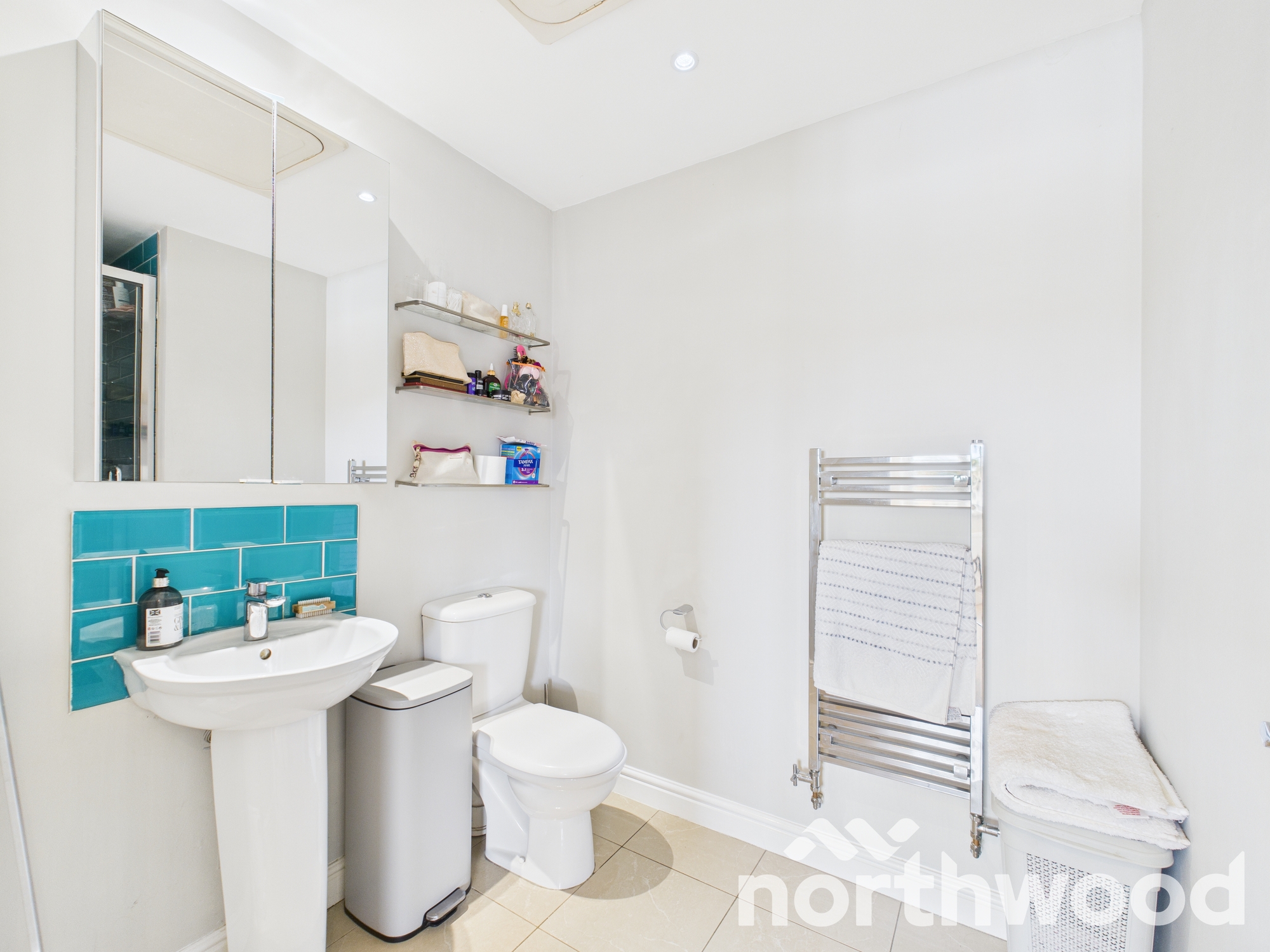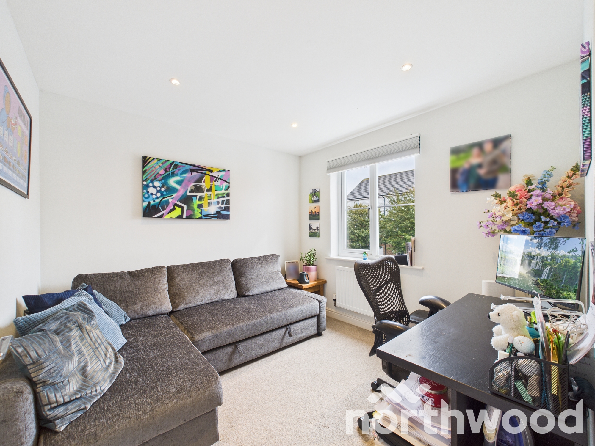 The first floor offers a spacious living room with elevated views and a calming atmosphere, ideal for relaxing evenings or hosting guests. You’ll also find the third bedroom, which works well as a child’s room, guest space, or additional office. The family bathroom is finished in neutral tones with modern fittings and a full-sized bath. Upstairs, the principal bedroom is a true retreat, complete with built-in storage and a stylish ensuite shower room. The second bedroom is also a generous double, perfect for children, guests, or shared living.