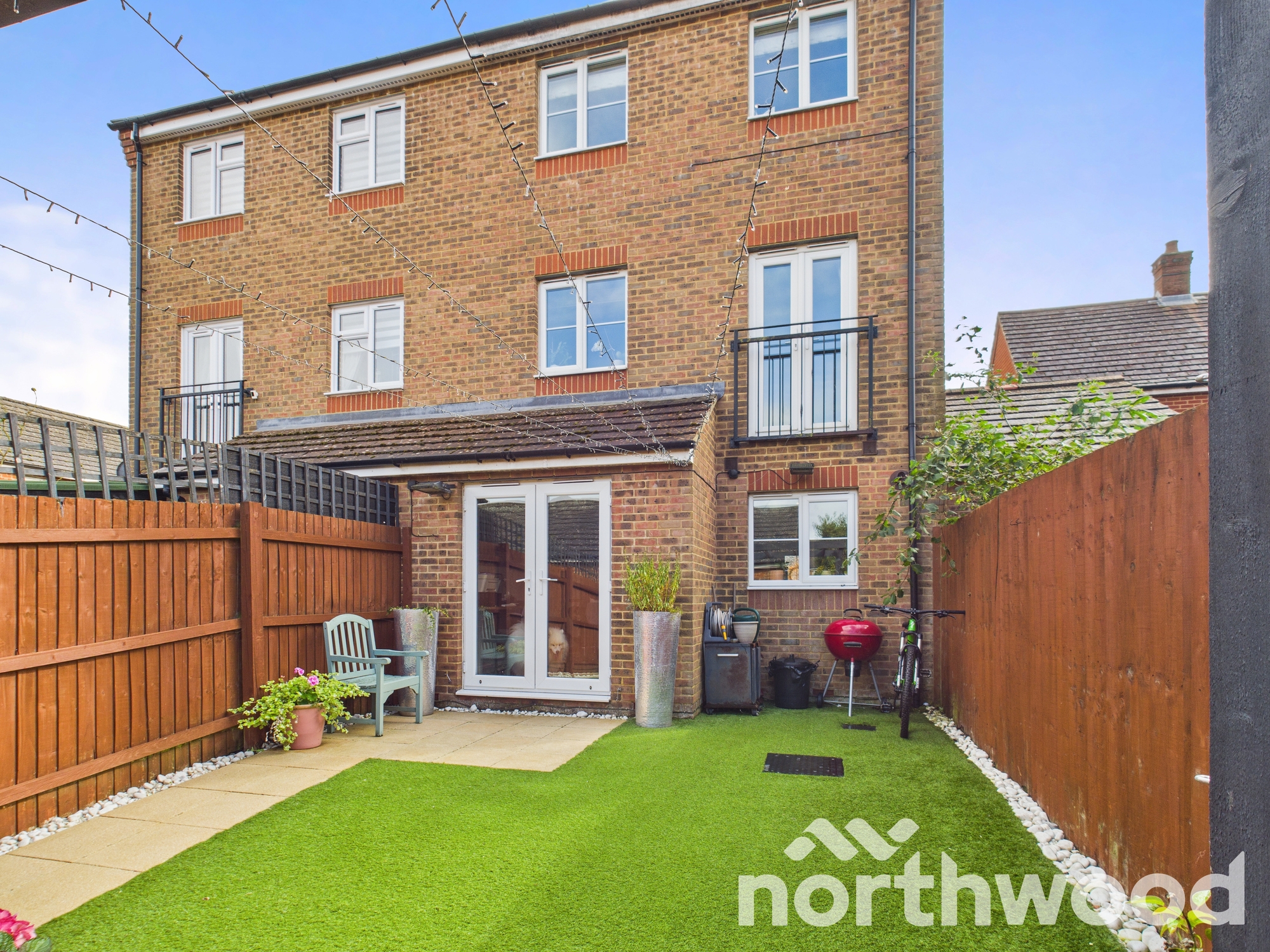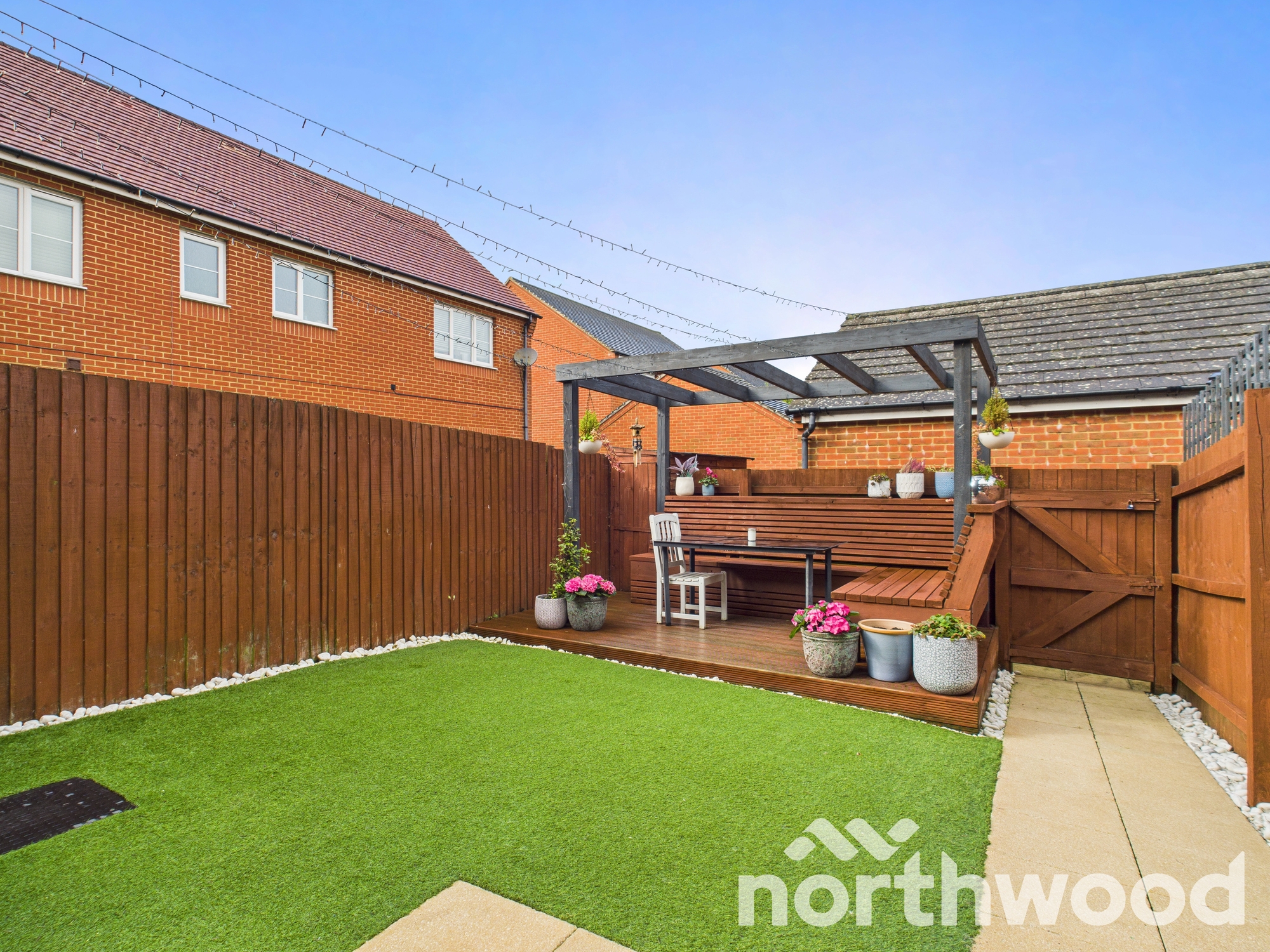 The rear garden is a private haven — thoughtfully landscaped with a raised decking area that’s perfect for summer dining or evening drinks. There’s also a lawned section for play or planting, and the driveway comfortably accommodates multiple vehicles.