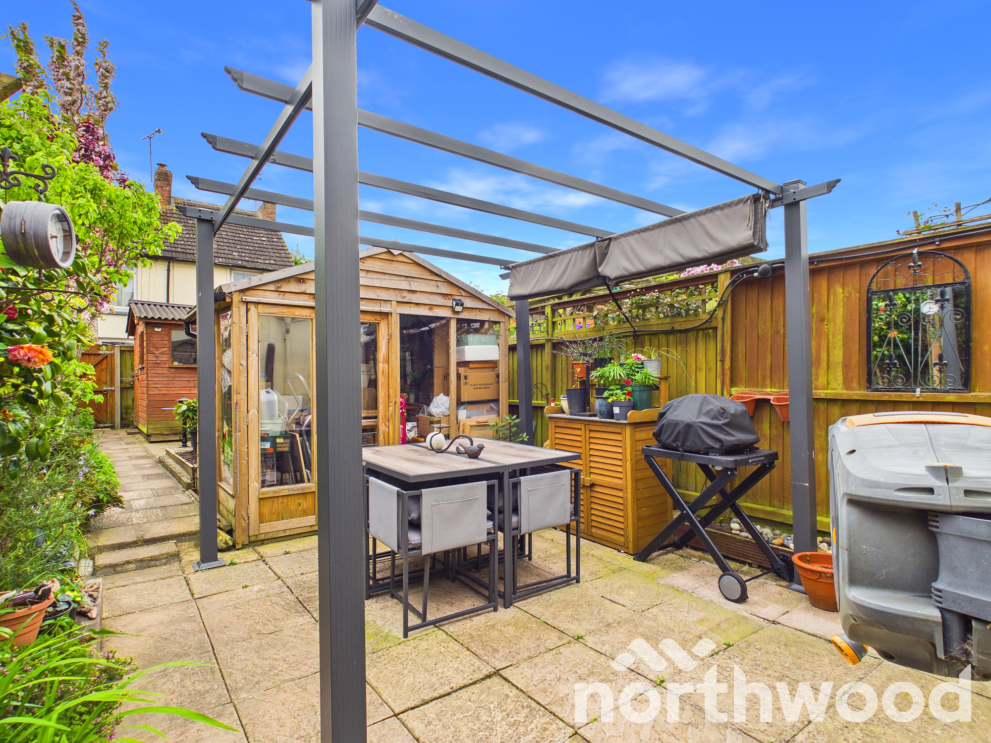 The garden is well arranged, with seating areas, planting and storage, making it a practical and enjoyable outdoor space throughout the year.