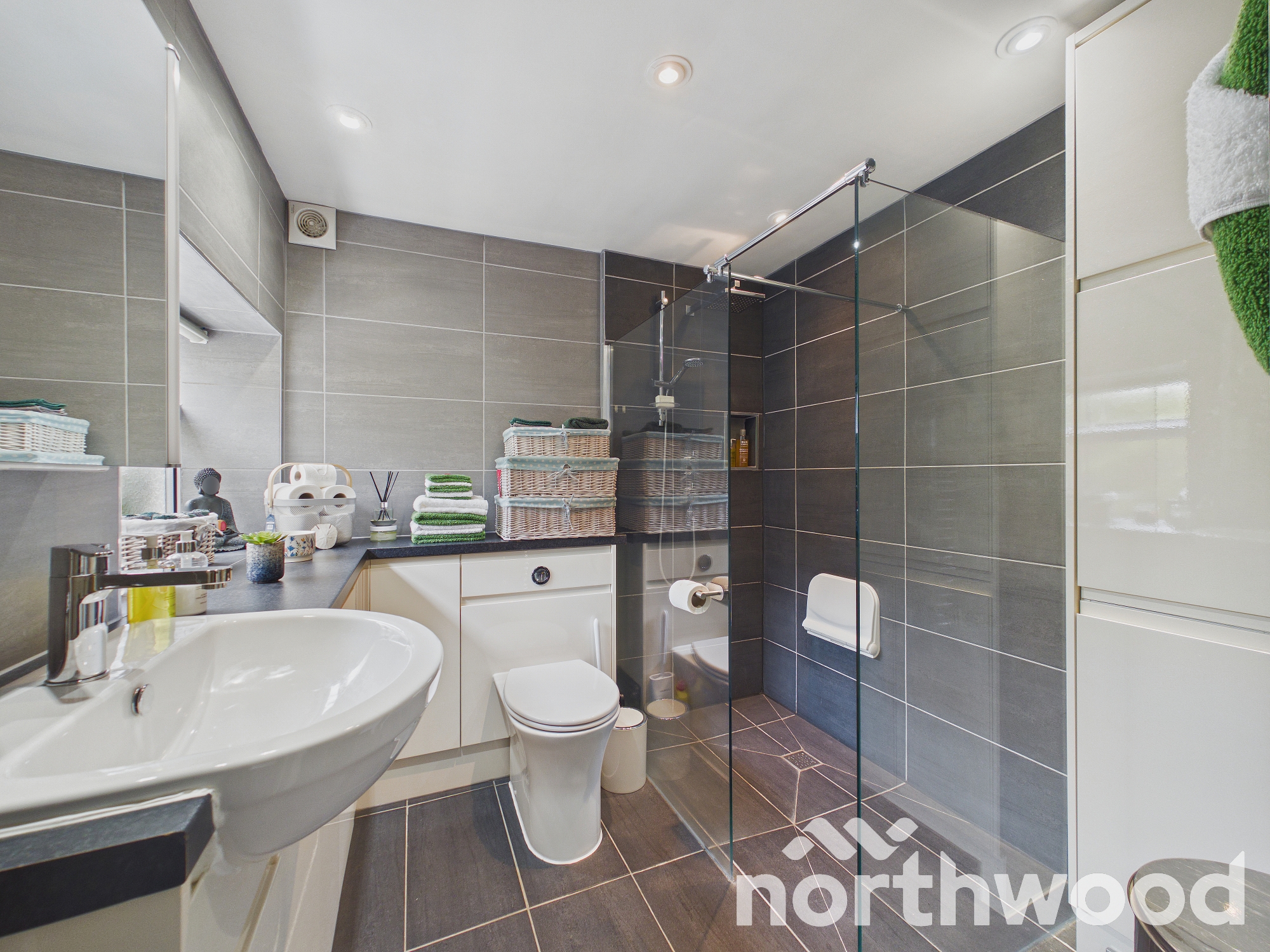 The ground floor shower room has also been recently upgraded and now offers a clean, modern and easy to maintain space. It includes a generous walk in shower, a white basin set on a practical countertop, a WC and useful open shelving for towels and toiletries. A heated towel rail provides added comfort and convenience, completing a well designed room that works perfectly for everyday use.