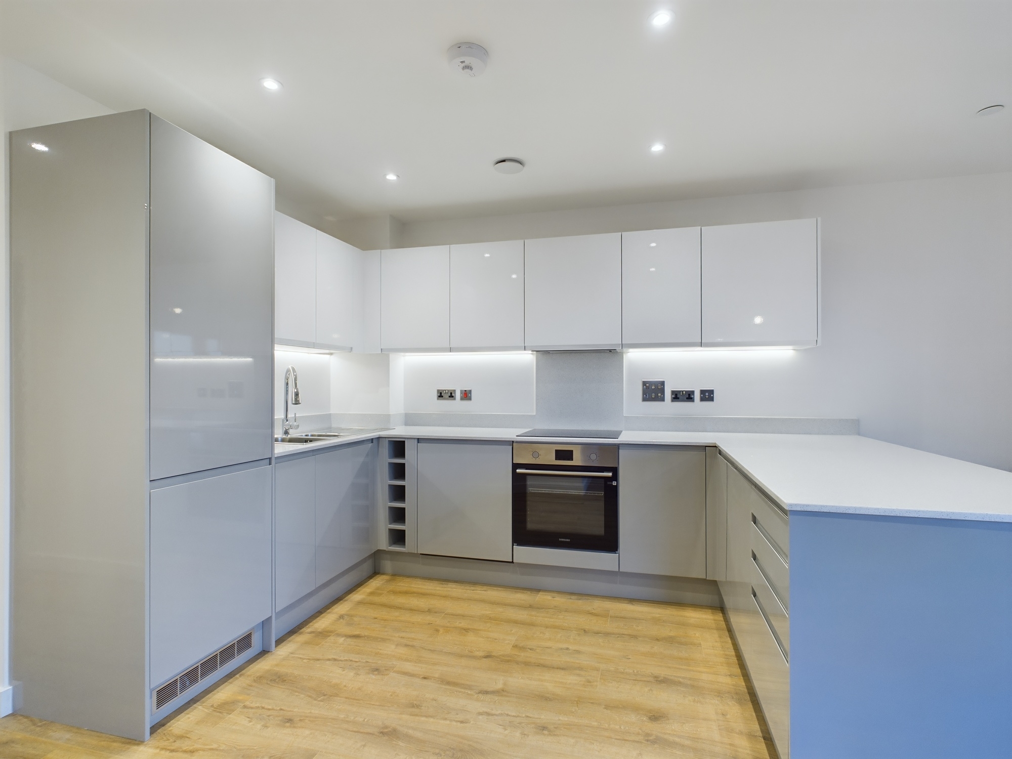 Every apartment benefits from a bright open plan living space, full height glazing, gloss kitchens with granite worktops, integrated Samsung appliances, contemporary bathrooms, oak effect flooring, designer finishes and access to private balconies or terraces on selected units. The building also features secure gated access, digital entry systems, bike storage, undercroft parking on selected plots and a Combined Heat and Power system for improved efficiency.
